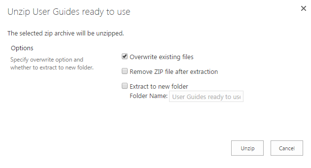 For Overwrite existing files option, it’s checked by default, and in our cases, it really doesn’t matter if it’s checked or unchecked. Because we have checked Extract to new folder, so the new extracted documents will be saved in a new folder in the User Guide Documents library. The extracted documents now are under a different path as that of the existing documents in the document library. So, no matter whether the existing documents in the document library are included in the ZIP files or whether we check or uncheck this option, the new extracted ones will not overwrite the existing ones in the document library. So, we just leave it as the default status, checked.