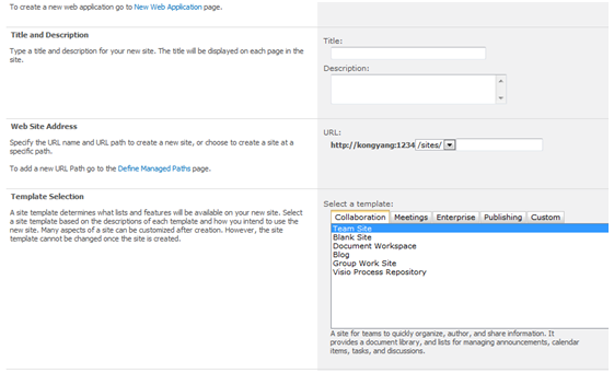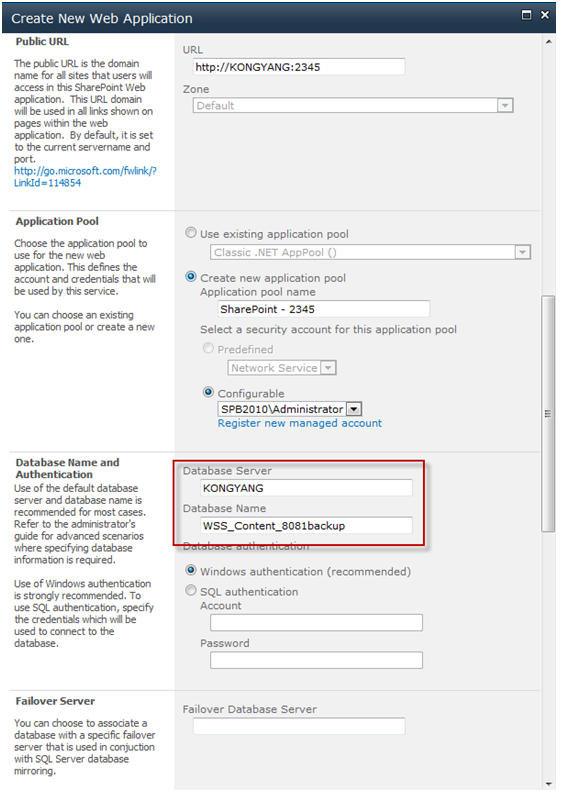 SharePoint site collection is based on the web application, so we need to create a web application for the target site collection. And don’t forget to take attention to the Database Server name and Database name.