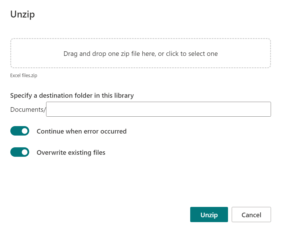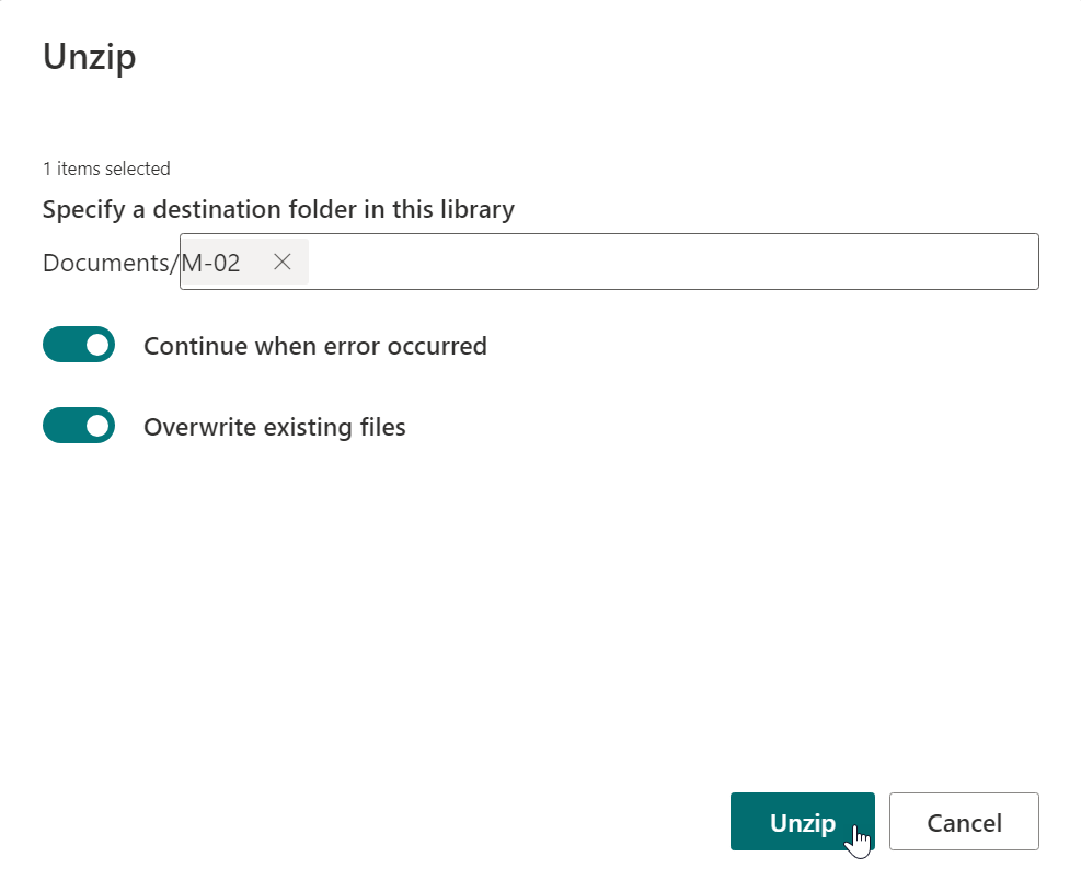 a. In the Documents library, select multiple documents and click on Zip in the top action bar. (Please note that the Zip or Unzip features are only available in SharePoint modern experience.)
