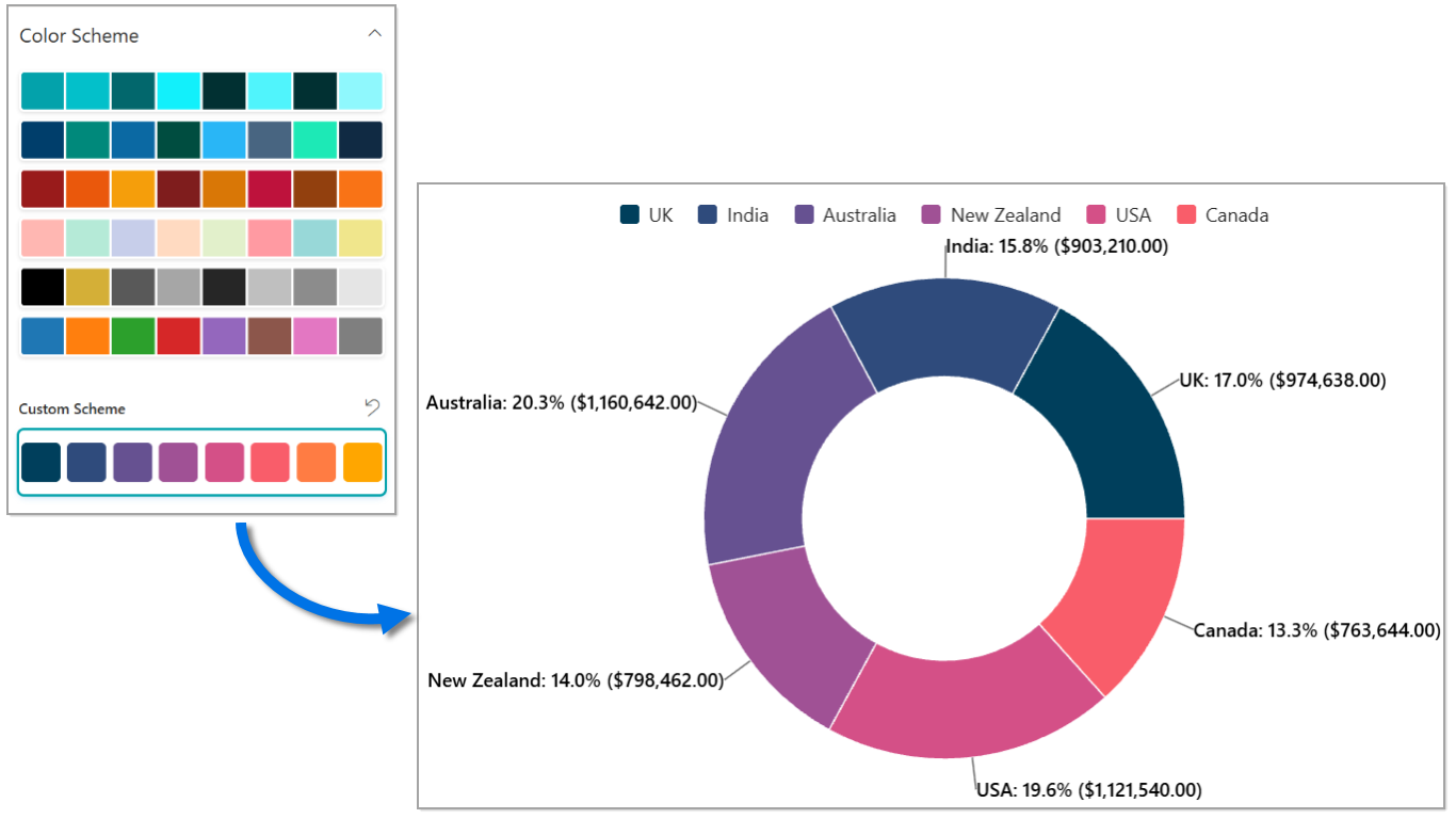 Make your reports pop while staying on brand. Choose from multiple pre-set professional color palettes or customize the themes to align perfectly with your organization's corporate identity with a single click.