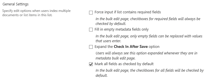 This product provides a settings page to configure and edit options when indexing multiple documents or list items. You can manage settings on a site or site collection level. After the settings are configured on a site, the sub sites or contained lists can inherit or customize (stop inheriting) settings. Follow these steps to enter the Bulk Properties Editor Settings page: